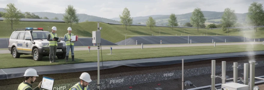 L’étanchéité des alvéoles repose en grande partie sur la géomembrane PEHD, véritable « peau » de protection entre les déchets et le milieu naturel. Le contrôle de cette étanchéité se fait en plusieurs phases : réception des matériaux (certificats de conformité, contrôle visuel des rouleaux), suivi des travaux de pose (plan de jointage, conditions météorologiques, qualification des soudeurs) et essais de contrôle des soudures. Les essais non destructifs incluent le contrôle par air sous pression des doubles soudures et le test à la cloche à vide sur les soudures simples.